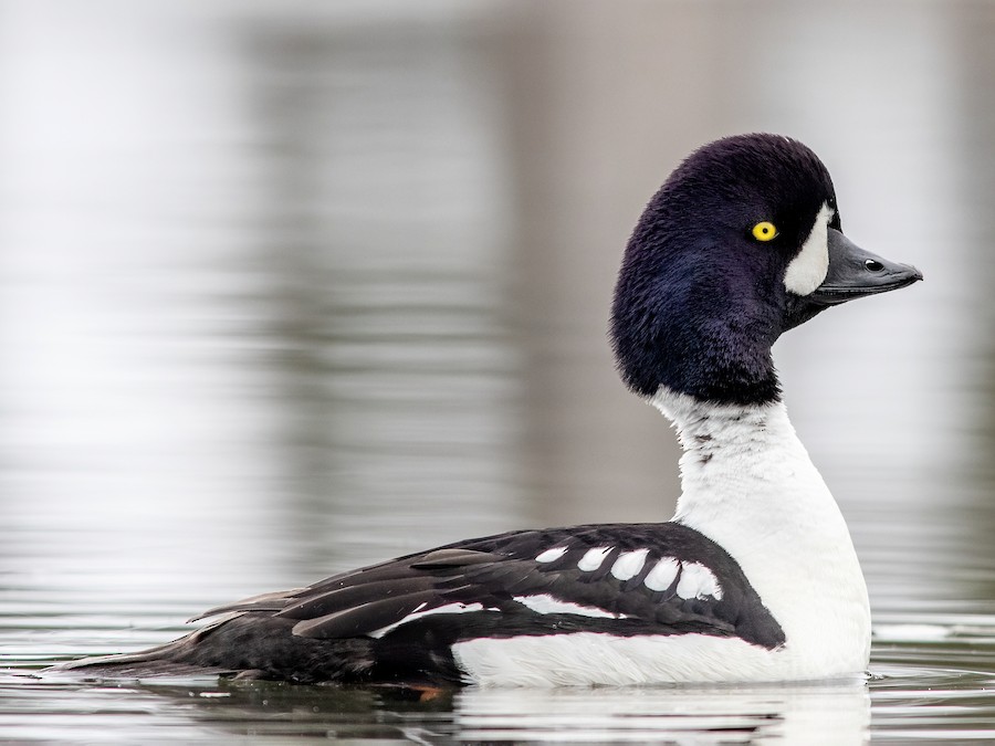 Striking diving duck of coastal harbors, mountain lakes, and large rivers. Very similar to Common Goldeneye. Males are easiest: Barrow’s has more black on the back, a downward-pointing spur on the side, and a crescent-shaped (not circular) white patch on the face. Females can be very difficult. Barrow’s usually has a yellow bill, but Common can rarely show a dull yellowish bill. Head and bill shape are important: Barrow’s has a steeper forehead and a puffy nape, and a shorter bill with a more rounded lower edge. Fairly common in western U.S. and Canada; much less common in the northeast. Small population in Iceland. Frequently found in mixed flocks with Common Goldeneye.