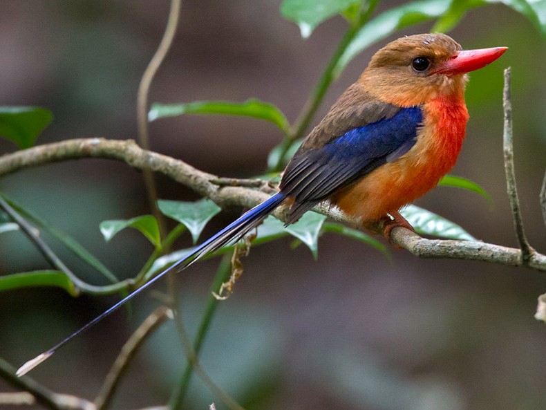A long-tailed kingfisher of lowland and foothill forest. Brown head and back, orange underparts and rump, deep blue shoulder and long tail with narrow white tips. Sits quietly in the mid-story, occasionally pumping the tail and flicking it right up when startled. Similar to Buff-breasted Paradise-Kingfisher, but Brown-headed has a brown rather than black and blue head and lacks the white stripe down the back. Song, a rising and falling (or just falling) and accelerating series of notes ending in a trill “weeep weep wewewewweewe……..”
