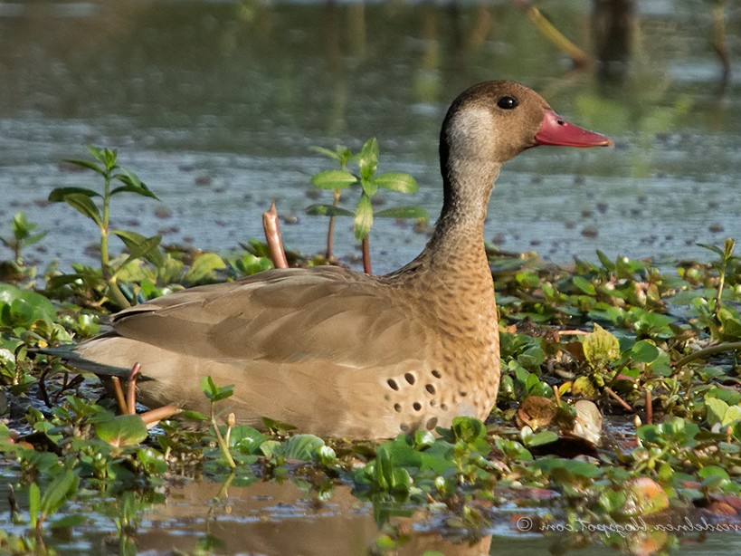Small, fairly common duck. Brownish at rest with a dark face, but striking in flight with a white inner wing panel contrasting with an iridescent dark green outer wing. Males have an orange bill, blue-gray in females. Encountered on lakes, ponds, rivers, marshy areas, and occasionally in more saline waters.