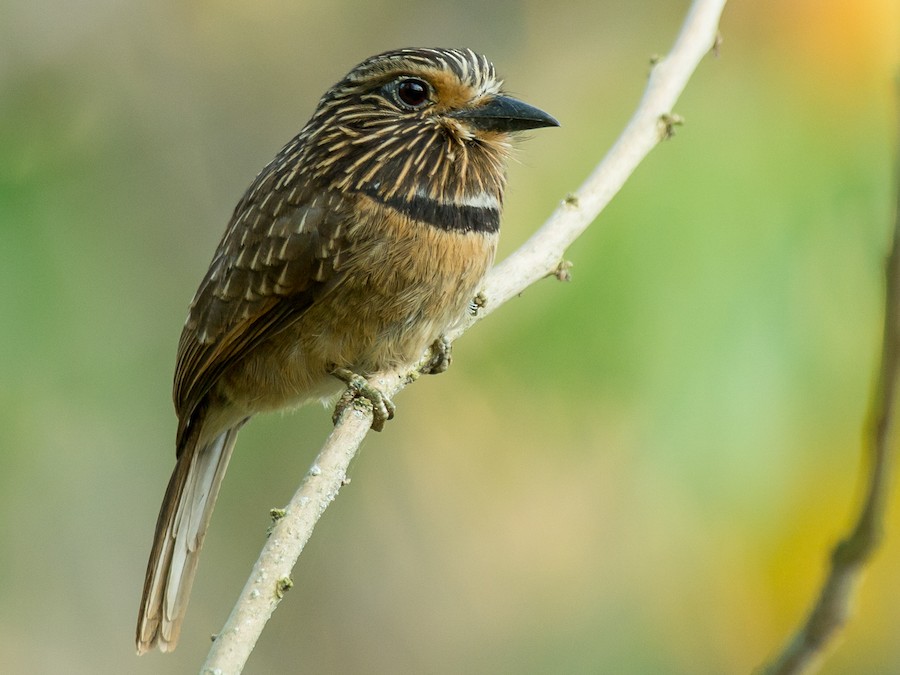 Cryptically plumaged puffbird. Brown overall with cinnamon streaks down the head, back, and wings. Note the distinctive black-and-white breast band. Usually sites motionless in the understorey and middle levels of humid forests and second growth.