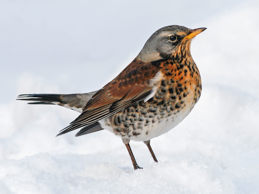 Rather large, subtly attractive thrush with blue-gray head, dark chestnut-brown back, gray rump, and variable peachy-buff wash on spotted breast. Breeds in forested habitats, often favoring wooded areas adjacent to more open foraging grounds; in winter, found mainly in open woodland, farmland with hedges, orchards, and parkland. Often breeds colonially and sometimes retains social habits on wintering grounds, mixing with Redwings and other thrushes in fields or in fruiting trees. Song is relatively unlovely for a thrush, a series of scratchy and garbled phrases. Call is a dry and powerful “chakchak”, rather like an old camera.