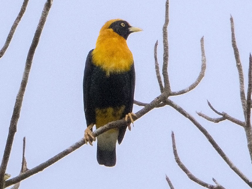 An uncommon, fairly large bird of lowland forest canopy. Black face, back and belly, pale, yellow bill, yellow eye, chest, neck and lower belly, and white below the base of the tail and wing patch, noticeable in flight. Races differ. Northwestern birds have an all-black head whereas central birds have a yellow crown. Often found in flocks at fruiting trees and sometimes associate with Yellow-faced Myna. Similar to Yellow-faced Myna, especially in flight, but Golden Myna has a black face, yellow chest and rump. Voice, a high-pitch, downslurred whistle, a short musical, bell-like phrase, repeated at intervals and a raspy, froglike “gauu!”.