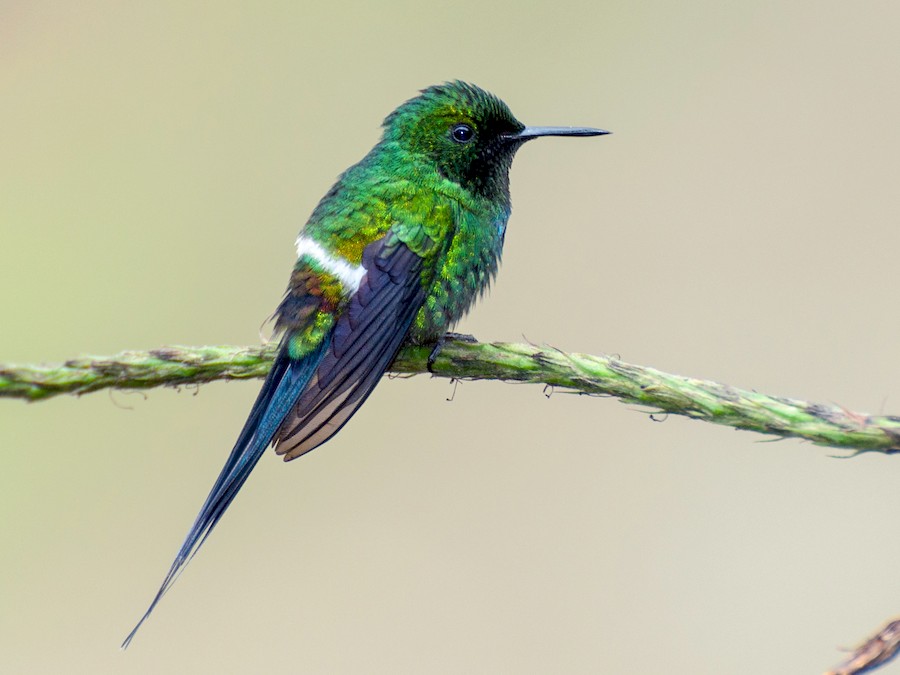 Tiny hummingbird with short straight bill. Male all shimmering green with distinctive, long, pointed tail feathers. Female has short tail and a distinctive white mustache. Both sexes show white band across rump. Most similar to coquettes but without orangey tones. Found in forested habitats and gardens; visits feeders.