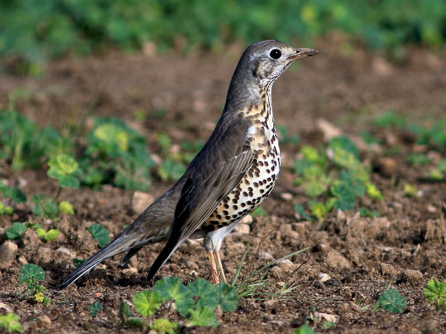 Uncommon to locally common in variety of wooded habitats, parks, and moorland with hedges and taller trees. Often feeds on larger lawns and grassy verges, often well away from cover. Rather large thrush, gray-brown above and whitish below with rather rounded dark spots; tail has small white corners, lacking in appreciably smaller Song Thrush. In flight looks rather pale and grayish overall, vs. dark brownish Song Thrush. Song similar to Eurasian Blackbird, very unlike Song Thrush. Dry rattle calls are distinctive.