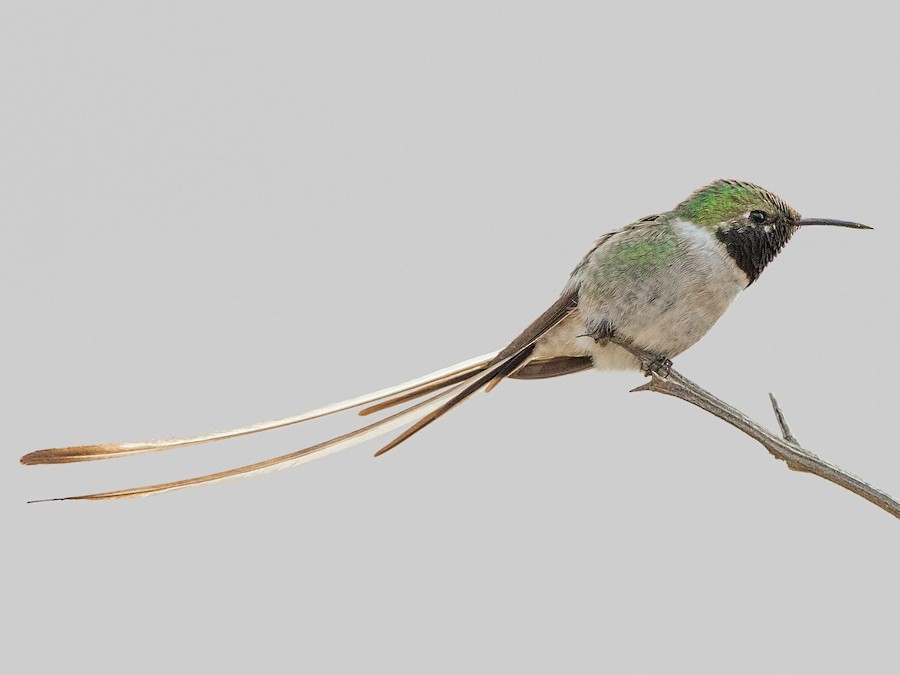 Tiny hummingbird of desert lowlands and foothills; found in gardens, agricultural areas with flowers, and native scrub. Adult male with long black-and-white tail “streamers” is basically unmistakable, but greatly outnumbered by females and immatures, which look much like several other small hummingbirds. On females and immatures note the relatively long tail with pale edging to the shorter central feathers and lack of rusty tones to the plumage overall.