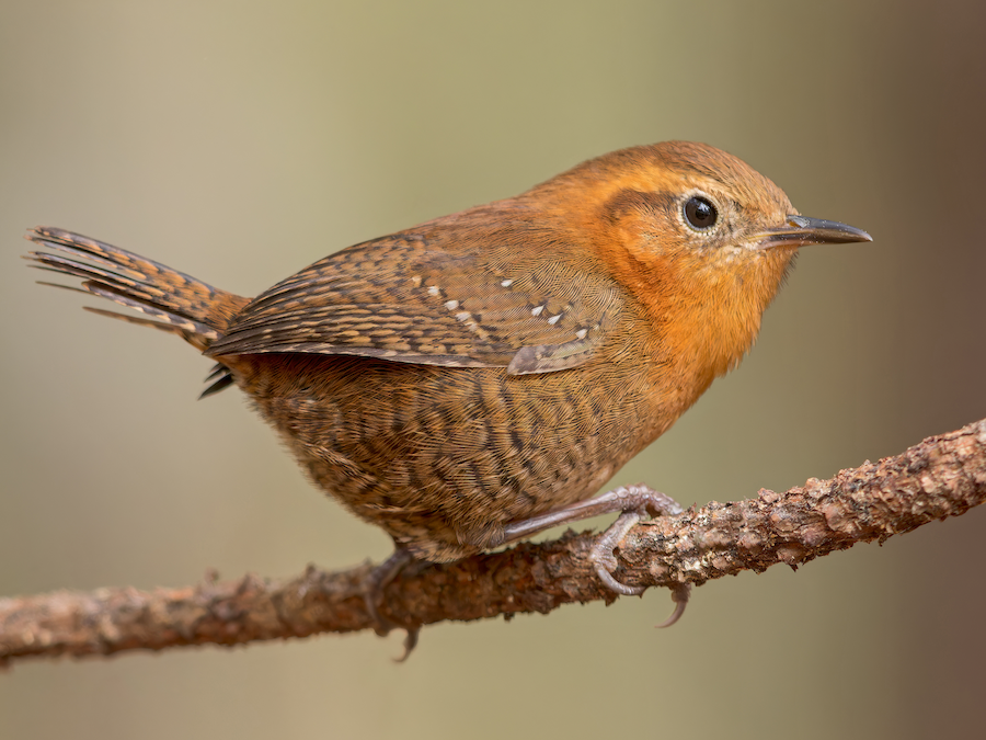 Very small, rather short-tailed wren of highland forests, woodland edges, thickets, and brush piles. Usually rather skulking, low in dense tangles, but sometimes sings from an exposed perch. Face and breast are bright rusty orange with pale eyering. Flanks, wings, and tail are obviously barred. House Wren is larger, longer tailed, and much duller and paler on face and underparts. Voice distinctive.