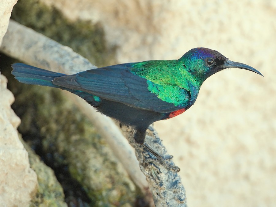 A medium-sized, long-billed sunbird in which males and females are very different. Males have a green head, a purple forehead, a red-and-yellow band across the chest, and a black belly. Females are plain, with olive-gray on the back and pale gray below. Found in dry thorn savanna, woodland, and gardens. Range does not overlap with any other species in which the males have a red belly band. Females can be identified by their darker underparts than other female sunbirds in the Arabian Peninsula. Vocalizations include chatters, trills, and a single “veet” note.