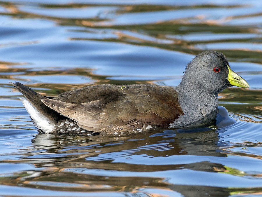 Small marsh bird with a disjunct range in South America, from central Colombia to eastern Brazil to central Chile. Note gray head and breast, warm brown upperparts, and brown flanks with white spots. Its greenish bill is distinctive. Singles or pairs can be seen swimming or walking in marshy habitat at the edge of lakes or ponds, sometimes remaining quite hidden. Unlikely to be confused, but compare with juvenile Common Gallinule, which has a dingy bill and a bold white stripe on the flanks.