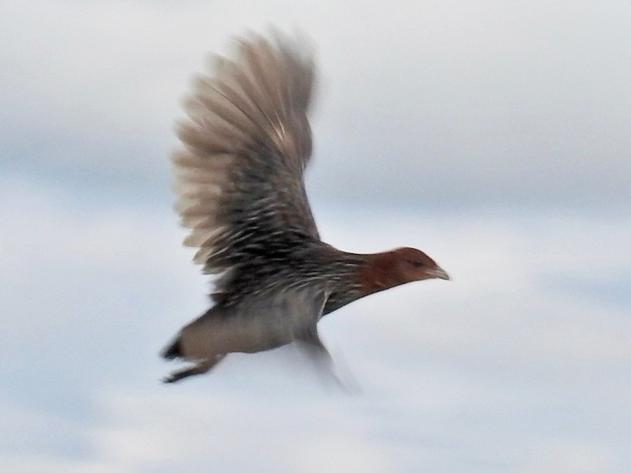 Small rail of grassland habitats. Very shy and elusive bird that is unlikely to be seen unless expressly searched for. Male has a rufous head and black body with heavy white streaks. Female is dark brown with barring below. Found mainly in seasonally flooded grassland, and sometimes in drier grassland. Main call is a simple, repeated hoot. Also gives quicker series of calls with a similar quality. Similar to Striped and Red-chested Flufftails, but males have more white below, with less rufous on the chest than Red-chested, and more than Striped. Females are darker below.