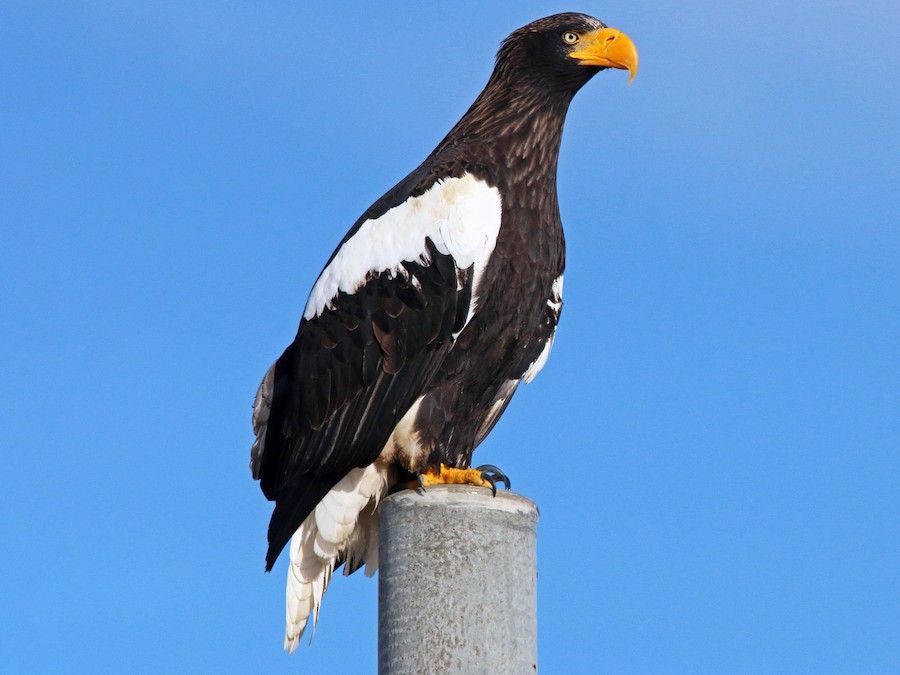 An immense eagle with large head and massive orange bill to match. Adult is striking, even from a great distance: rich brown overall, with snow-white tail, belly, and shoulder patches. Juvenile and immatures darker but usually acquire mostly white, wedge-shaped tail in second year. Younger birds can be confused with young White-tailed Eagle, but Steller’s distinguished by larger bill, wedge-shaped tail, and unique wing shape, narrow at the tip, bulging in the middle, then narrowing near the body. Plucks fish from icy seas and follows fishing boats for scraps. Often associates with White-tailed Eagles where prey is abundant.