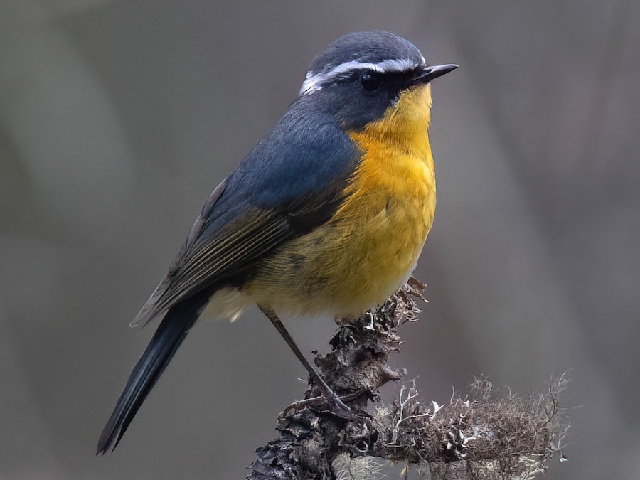 Small, furtive, ground-dwelling songbird with thin white eyebrow. Adult males are slaty above and dusky ochre below, with a bright white eyebrow. Female is duller and browner overall, with a thinner eyebrow. Breeds in montane forests, favoring areas with a dense brushy understory, such as dwarf bamboo or Rhododendron. Descends into foothills during the winter, generally in similarly dense habitats. Song is a short burst of pleasant warbled notes, and calls include a rising and mellow “wheet.”