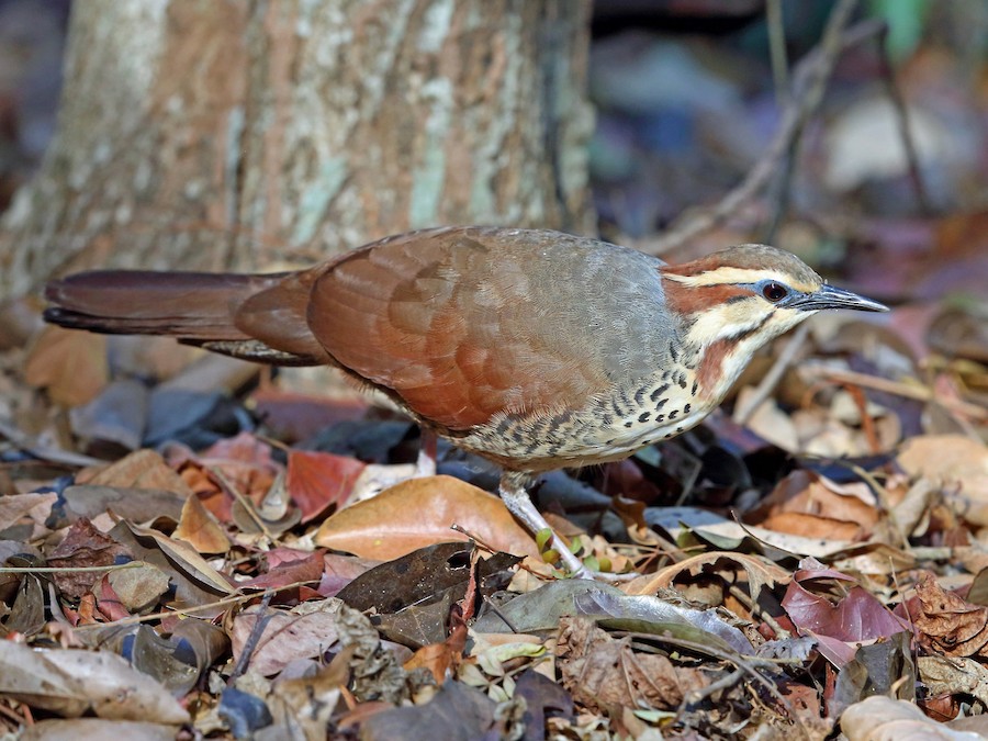 Odd ground-dwelling bird that is rarely seen by those not looking for it. Brown upperparts, pale underparts, and elaborately striped head. Usually seen in pairs or family groups, walking on the forest floor. Defense behavior is to fly into a tree and freeze. Patchily distributed, mainly in western dry forest, but locally also in rainforest. Call is an incredibly loud and strident mix of clear “whee” notes and fast chuckling notes, usually given in duet by a pair. Can be separated from other mesites by range. Walks on the ground like Madagascar Buttonquail, but much larger and longer-tailed. Could be confused with White-throated Rail, but shorter and slimmer, longer-tailed, with pale underparts. Also slimmer, longer-tailed, and more elaborately patterned than a wood-rail.