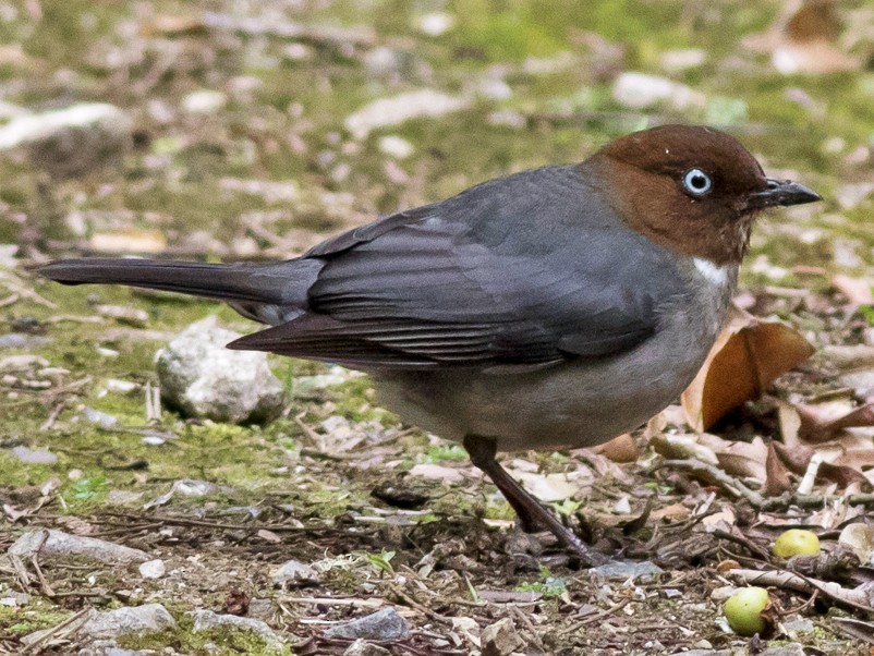 A medium-sized dusky bird that prefers moist montane forests, but can be also found in most wooded areas with dense vegetation. Feeds in trees and on the ground. Its namesake white eye is distinctive, but its bright broken white throat collar, contrasting so markedly with its dark plumage, is also unique. Shier than the somewhat similar White-chinned Thrush, which has a dark eye, orange bill and legs, and lacks a white collar. The White-eyed Thrush’s song is a long series of highly variable, repeated phrases (phrases most often repeated thrice, but commonly from two to five times). Calls include a plaintive whistled “weee-woooo,” with the first note slightly higher and a quick, almost ducklike “yak.”