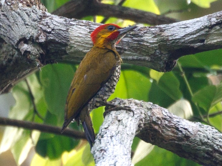 Medium-sized woodpecker with a bold, yellow stripe through its face. Inhabits lowland and foothill rainforest. Both sexes have olive-green back, scaled breast, and barred belly. Male has red crown and mustache stripe; female has red only on hindcrown. Similar to Yellow-throated Woodpecker, but a white throat and much less yellow on face. Compared to Golden-green Woodpecker, breast is scaled (not barred), and eye is dark. Forages at middle to upper levels of the forest, often with mixed-species flocks. Typical call is a hoarse scream.